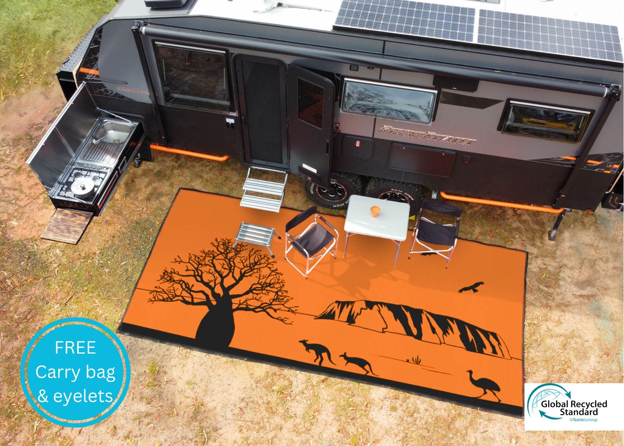 Our Australian Design mat brings a bold, earthy vibe to your campsite—designed for those who love this great southern land. The striking rust and black colour combo adds warmth and depth to your setup, while the silhouette design celebrates the spirit of the outback. Fully reversible, it gives you two great looks in one practical mat.
