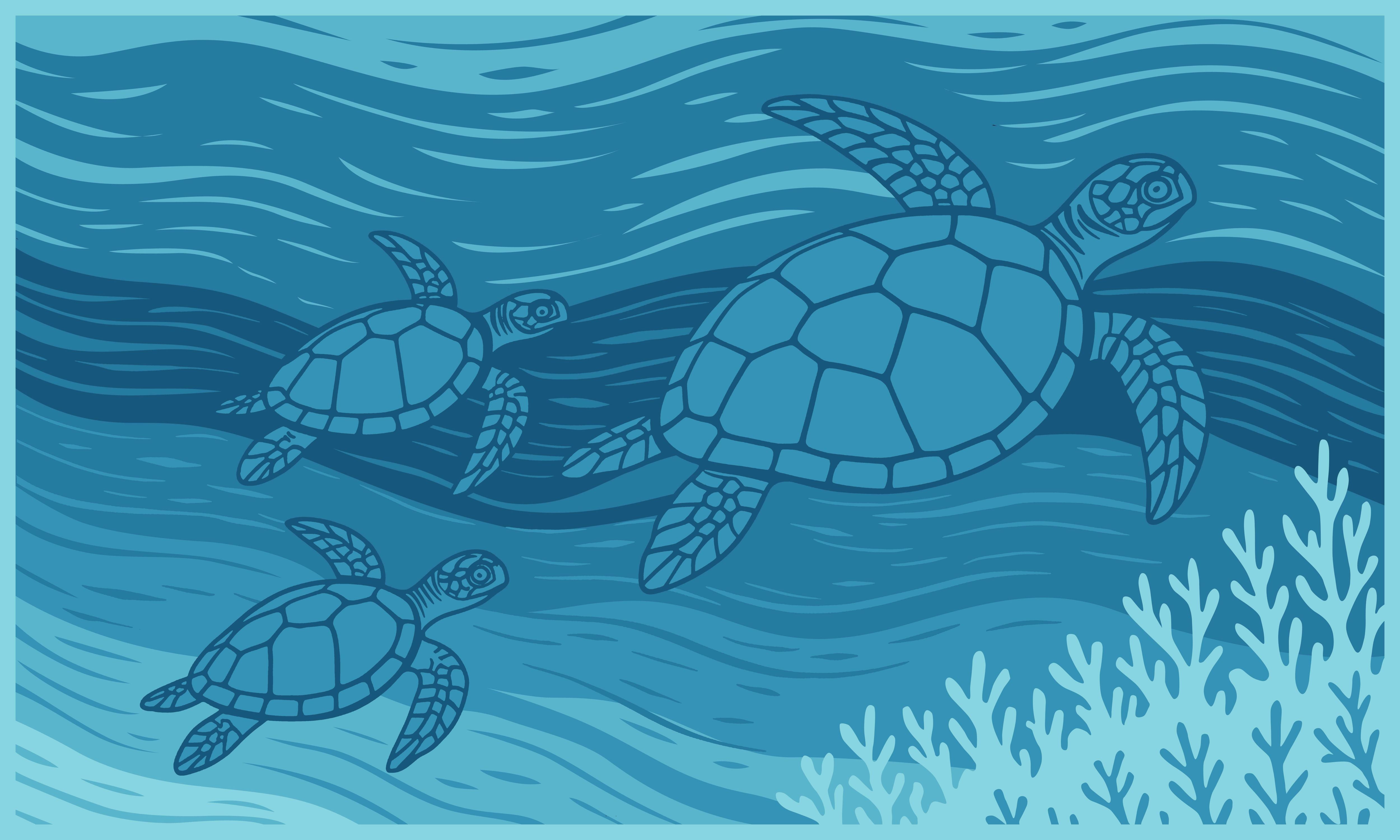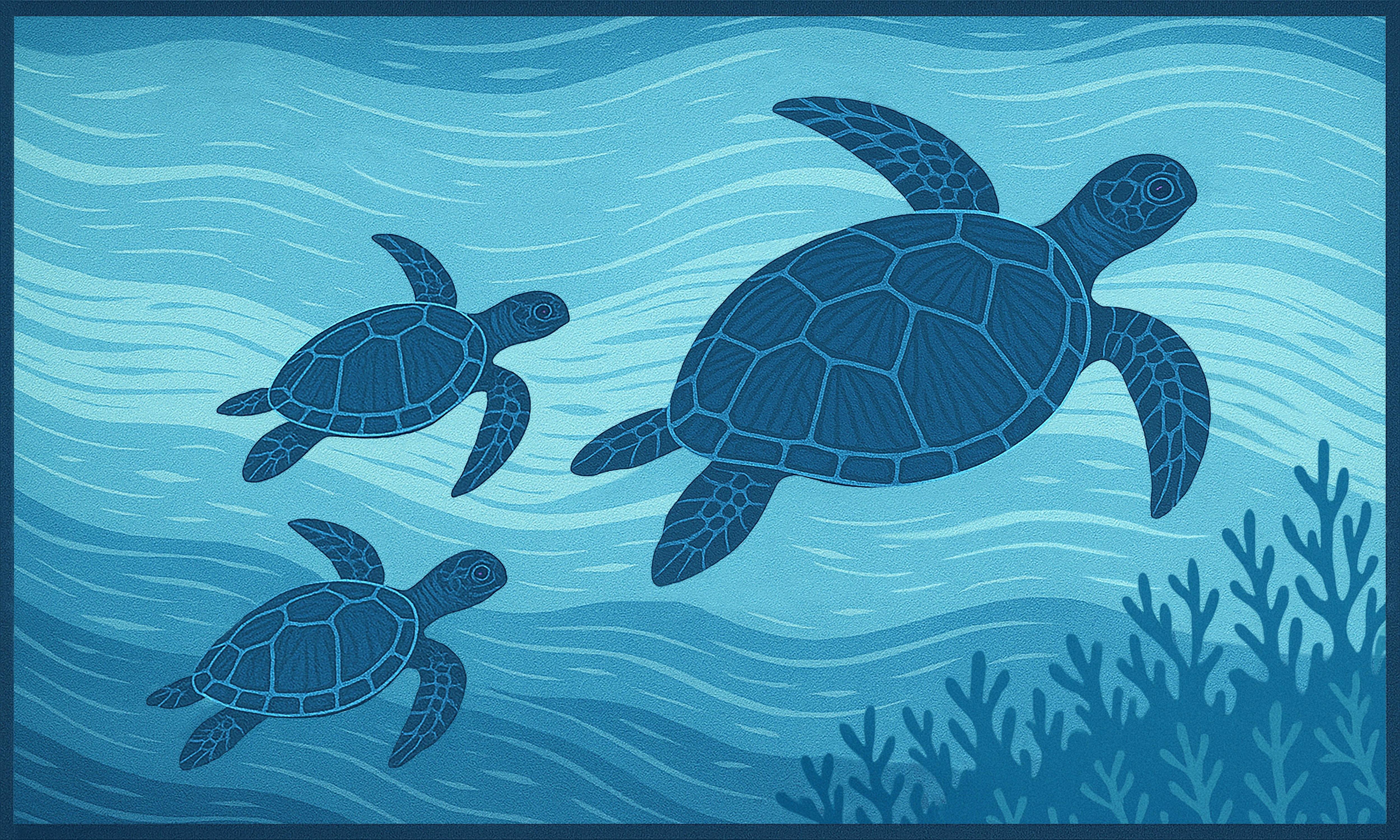 Inspired by the quiet power of turtles swimming in unison, Crush captures a moment of connection and movement in the open blue. With flowing lines and bold silhouettes, this design celebrates the ocean’s rhythm — steady, strong, and endlessly grounding.