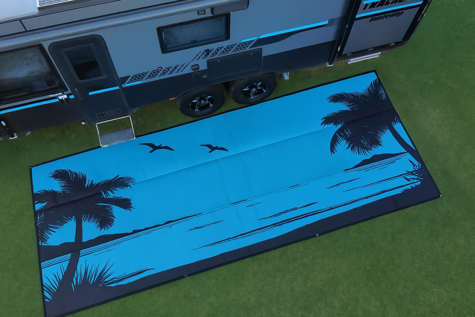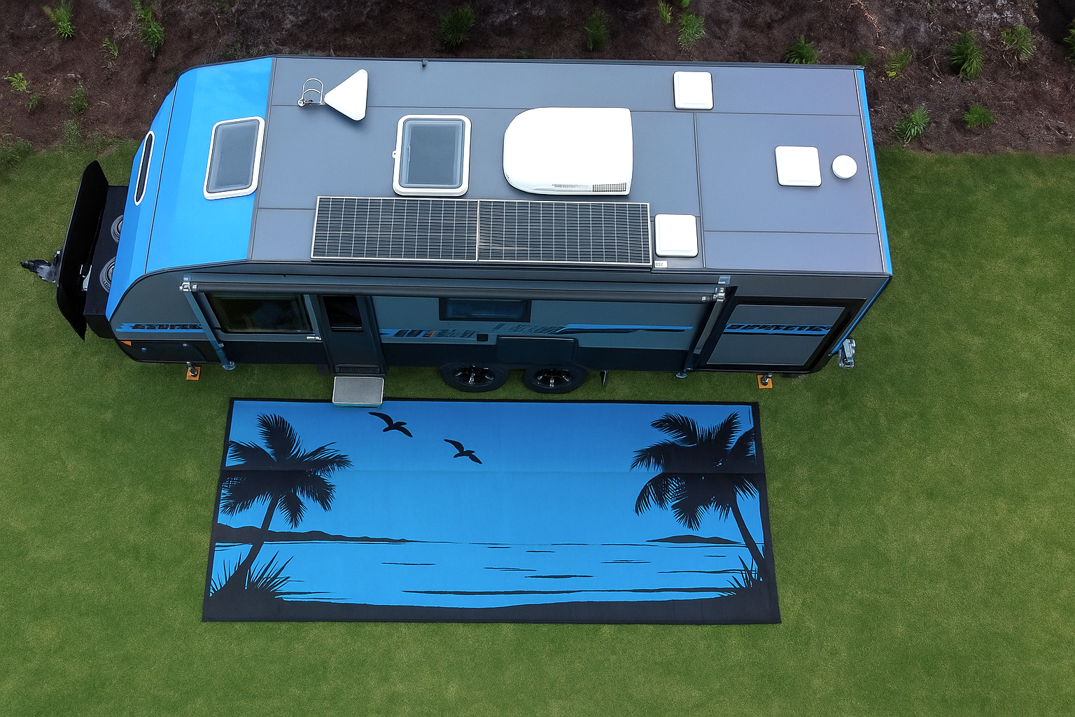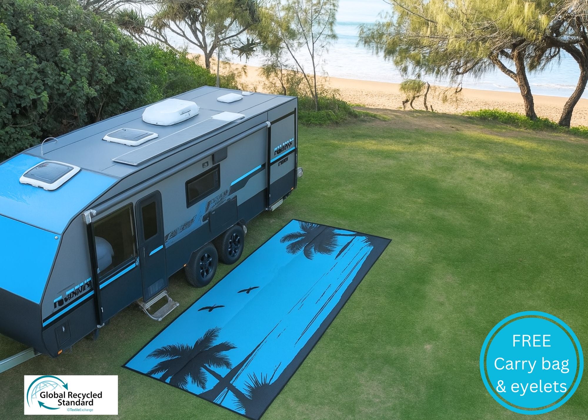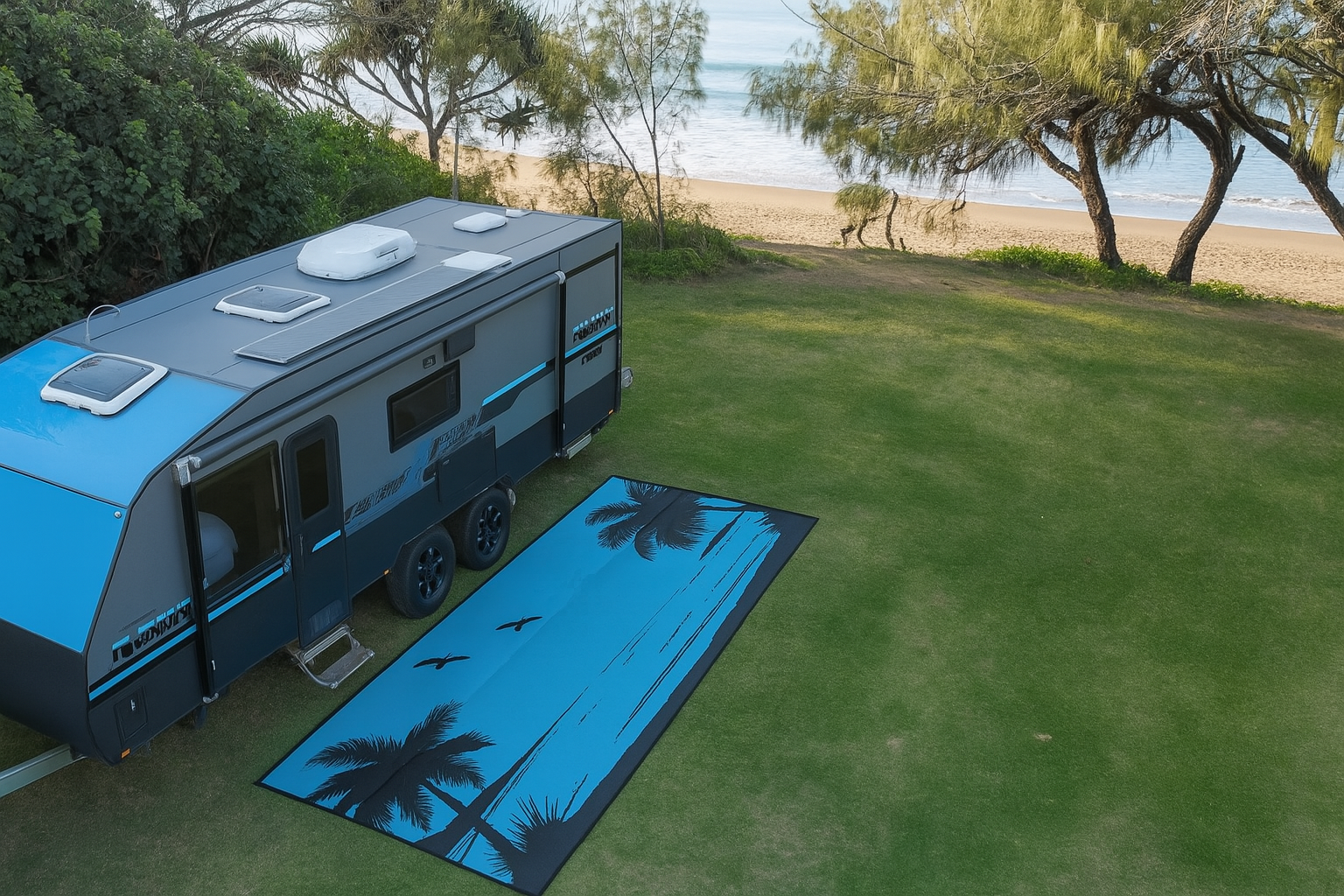 Our Beach Design mat brings a relaxed, coastal vibe to your campsite—no matter where you are! While it’s perfect for beachside getaways, it’s equally at home out bush, letting you imagine the sea breeze wherever you’re parked. Available in a vibrant turquoise and black combo, the design is fully reversible, so you can flip the mat to suit your decor or mood.