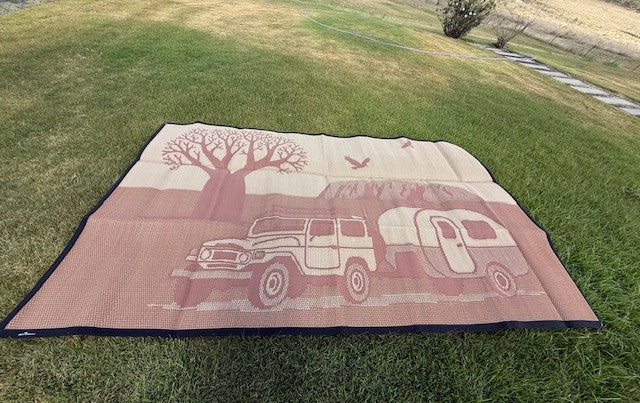 Featuring iconic elements of the outback — the rugged 4WD, vintage caravan, ancient boab tree, and Uluru in the distance — this mat captures the essence of free camping and endless horizons.
